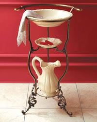 幾十年前,我們就已經(jīng)見過類似的洗臉架了,只不過當年以木制為多,上面一格放著臉盆,下一格就放肥皂盒之類的,背后還有一個架子可以掛毛巾擦手。在歐洲,這樣的款式才是經(jīng)典,看似老派卻從未落伍,特別是那只倒水的壺,線條極其優(yōu)雅。