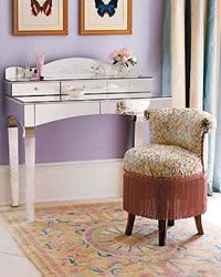 衛(wèi)生間里鋪地毯,實在是很奢侈的事情,因為地毯非常吸潮,不過這一塊薄薄的花毯賦予極大的女性化色彩。同樣富于女性化色彩的還有那張鏡面化妝臺,式樣簡單,帶三個小抽屜可以放些小零小碎,臺面上再擺一小盆花。這套衛(wèi)生間家具的風格十分歐式,尤其是那張流蘇小椅,其實這樣的潮流離我們已經(jīng)很近了。