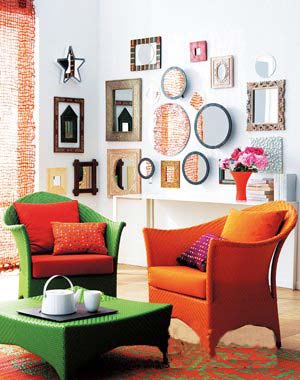 旅行時收集的裝飾框,不必為風(fēng)格、材質(zhì)和顏色的沖突而擔(dān)心,把它們鑲嵌上鏡子,集中展示在墻面上,保證成為居室中的亮點(diǎn)。