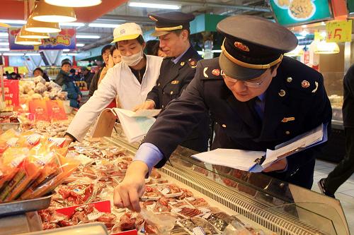 2月28日,十一屆全國人大常委會第七次會議表決通過了《中華人民共和國食品安全法》,該部法律將自2009年6月1日起施行。這是2008年12月30日,北京德勝工商所執(zhí)法人員在檢查轄區(qū)內(nèi)超市里的肉制品。 新華社發(fā)