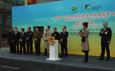 2009年2月25日,陜西環(huán)球嘉禾板業(yè)有限公司麥秸定向結(jié)構(gòu)板生產(chǎn)線工程奠基典禮儀式在楊凌示范區(qū)隆重舉行。陜西省副省長、楊凌示范區(qū)管委會主任姚引良,楊凌示范區(qū)黨工委書記、西北農(nóng)林科技大學黨委書記張光強,陜西省人民**副秘書長史俊通,管委會副主任郭建樹、張宏,建設(shè)部住宅產(chǎn)業(yè)化中心婁乃琳,中國建材總院副院長隋同波,陜西省環(huán)保局副巡視員連鋒,德國Mayfair財團老板Christian Herz、執(zhí)行總裁Rainer Kutzner,荷蘭Panel Board Holdings農(nóng)業(yè)纖維板材有限公司總裁Krijn Leendertse等有關(guān)方面領(lǐng)導(dǎo)和企業(yè)界朋友出席了奠基儀式。