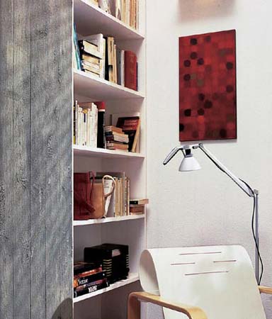 大型衣柜一側(cè)的白色書架延續(xù)客廳書架的收納方法,避免了整面墻的擁堵感,令視覺效果更為豐富。在白色書架旁邊, 安排了一條同客廳一樣的灰色木質(zhì)墻飾,成為豐富墻面表情的細(xì)致之舉。一張椅、一盞落地?zé)簟⒁环t色的裝飾畫,為臥室?guī)戆察o氣氛。