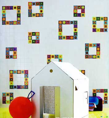 小塊瓷磚在拼貼時有更高的自由度。一片圖案鮮艷的瓷磚單獨看起來很漂亮,但鋪滿一面墻的話,往往眼花繚亂。以白色為底,花色磚為裝飾,拼貼出各種圖形的方法,可避免這種雜亂無章的現象。