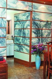 推開玻璃門,里面真是別有洞天。一整面墻被一幅巨大的潑墨山水畫所覆蓋,說得確切點(diǎn),這一面墻就是一幅畫?!拔蚁矚g中國的字畫,不一定非是什么名家名作,閑暇時(shí)候看看,眼睛都覺得舒服?!睆埾壬綍r(shí)工作壓力很大,借助這些淡雅脫俗的字畫可以舒緩白天緊張的神經(jīng),“這是我的一個(gè)親戚畫的,完全按照我家墻的尺寸,然后由師傅精心地一小幅一小幅地裁下來,做好實(shí)木框架,嵌入畫,再鑲上水晶玻璃,然后再一幅幅地釘?shù)綁ι先ァ!?/P>