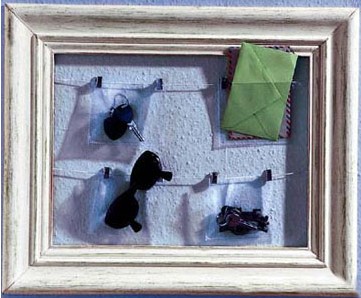 在玄關(guān)處掛一個(gè)畫(huà)框,根據(jù)需要在橫向固定幾根細(xì)線,準(zhǔn)備幾個(gè)放膠片的小塑料袋和金屬小夾子,把需要收納的物品裝在小塑料袋里,然后把透明的小塑料袋像晾衣服一樣夾在細(xì)線之上。每個(gè)家庭可以根據(jù)需要收納物品的多少?zèng)Q定畫(huà)框的大小,在畫(huà)框背后涂刷一塊色彩鮮艷的背景,更可以將展示作用發(fā)揮到極致。