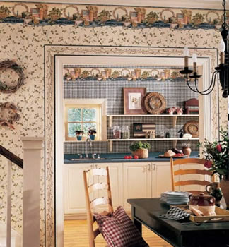 長久以來,壁紙更多的被用在臥室、起居室和客廳、書房,甚至用在衛(wèi)生間,卻極少用在廚房,因為它防油膩的能力較低?,F(xiàn)在你完全可以挑選一些防水壁紙,比如大花的圖案來搭配具有古典風(fēng)格的廚房、條狀圖案來與簡約式廚房相配。如果你的客廳用的就是壁紙,那么就可以與廚房的風(fēng)格一致,整體感會更強烈。防水壁紙要比一般的普通壁紙略貴,而且花色也要少一些。