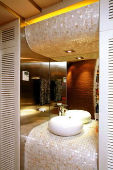 要想省空間,可以把洗手臺(tái)外置,和墻面找平就可以了。而找平的其他空間,完全可以用來儲(chǔ)納,當(dāng)然,用來變圓形的四方角落也是制作儲(chǔ)納柜的好地方。