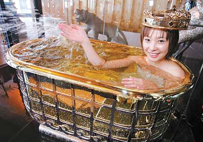 日本東京一家連鎖飯店展示了一款用18k黃金制造的浴盆。浴盆長1.2米,深度65厘米,制造時消耗了50公斤的黃金,價值1.2億日元(約合110萬美元)。
