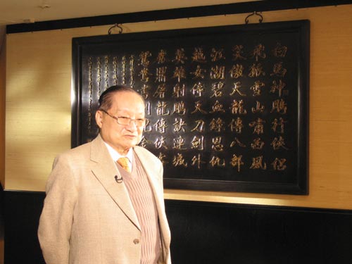 編者按:走進(jìn)位于香港北角海旁的明河出版社,迎面只見那幅筆走龍蛇的著名對聯(lián)──“飛雪連天射白鹿,笑書神俠倚碧鴛”。這幅以金庸平生所著武俠小說的書名之首串成的對聯(lián),與沿墻而立的落地大書柜中滿滿擺放的不同時期不同文字的小說版本,見證著金庸八十余年的快意人生,也成為金庸近日榮獲“2008影響世界華人”終身成就獎的最好批注。
