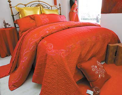 床兩旁高高地掛上一對(duì)中國(guó)結(jié),如兩個(gè)鮮紅的蠟燭,床上再鋪上那張揚(yáng)的大紅色,精致的繡花圖案上是一幅龍鳳變形圖,令人不禁想起了喜慶的洞房花燭夜,富有濃濃的中國(guó)風(fēng)情。以前的女子待嫁之時(shí)會(huì)整天呆在閨房里為自己做刺繡,從手帕、新衣、枕套到被面,一針一線,縫的都是少女喜悅的心情,這喜悅?cè)缃窬吞S在枕間被里。