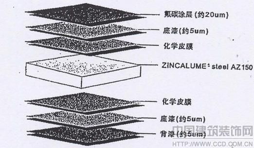 常熟市沃爾碼商業(yè)廣場項目金屬幕墻所采用的彩色鋼板為廣州博思格來實公司所生產(chǎn)的彩鋼板,其具有以下特點:彩鋼板抗腐蝕性能、防潮性能、抗粉化性能、抗化學(xué)性能均達到了一個較高水準(zhǔn)。博思格來實公司的彩鋼板其基板為優(yōu)耐板,系鍍鋁鋅合金鍍層。涂復(fù)前進行特有的抗銹蝕化學(xué)鍍膜處理;正面底漆層,涂復(fù)厚度5μm的聚酯底漆;鋼板正面涂層采用KYNARORPVD涂層厚度為20μm;鋼板背面淺綠色涂層,其厚度為5μm;背面底漆層為5μm厚環(huán)氧基樹酯。涂層結(jié)構(gòu)如圖2。