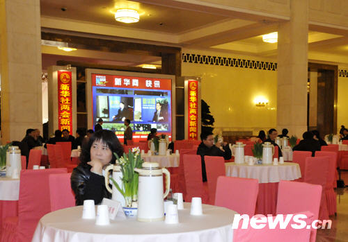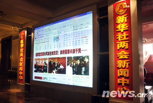 大廳里有新華社設(shè)立的兩會新聞中心展示屏幕(陳濤 攝)