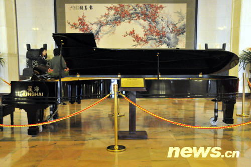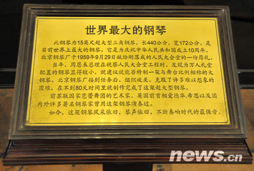 從人民大會堂東門進(jìn)去后的東大廳里,展放著世界上最大的鋼琴(陳濤 攝)