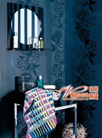 優(yōu)雅的復(fù)古花紋就在盥洗區(qū)的墻面上,雖然也是黑色的,亮光效果卻能在亞光底色上脫穎而出,為黑白基調(diào)的衛(wèi)浴空間增添了一份優(yōu)雅的味道。彩條圖案的毛巾也不可缺少,因為它不但是衛(wèi)浴生活的必需品,同時又不失裝飾性,為視覺增添欣賞點。