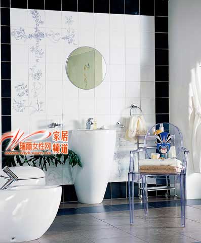 白色潔具用小花點綴,可將黑白格調(diào)的空間襯托得別致又活潑