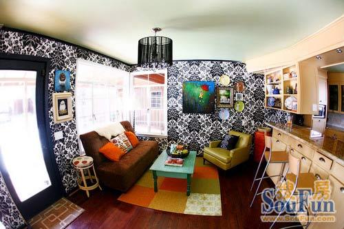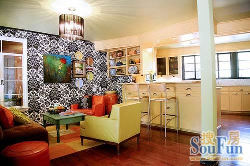 休閑區(qū)的一角——一巴洛克風(fēng)格的壁紙點綴色彩豐富的裝飾,紅色的沙發(fā)、蒲團讓空間呈現(xiàn)出多層次的色彩維度。開放式廚房設(shè)計讓空間顯得明亮寬闊,白楓木的櫥柜設(shè)計兼具了吧臺功能。