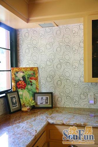 廚房的一角——帶有棕色花紋的大理石臺面皎潔省會,抽象的壁紙體現(xiàn)出主人的品味。細節(jié)裝飾在那個空間都有體現(xiàn),是女性家居的特質(zhì)。簡單的畫作與孩子的相框點綴出家的溫馨。