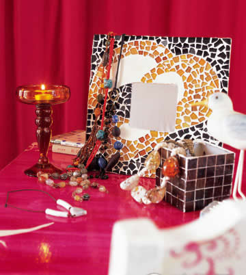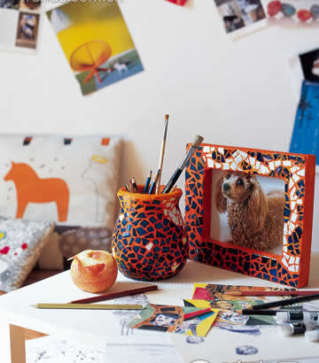 即便是最普通的陶瓷馬賽克,換一種彩色填縫劑,也能變成精彩的桌面裝飾。做相框的馬賽克,既可以一片一片整齊排列,也可以敲碎之后隨意拼貼,隨心情不同,效果也不相同。