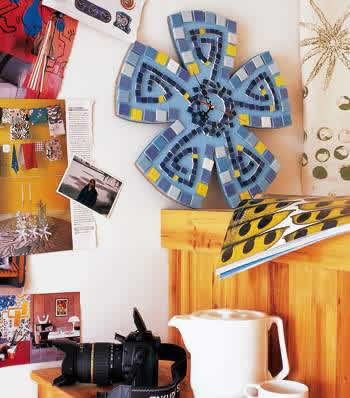 一款普通的花形掛鐘,因為馬賽克的參與而精彩。馬賽克拼花在視覺上給人美感,由于沒有填縫,高低錯落更有一種立體感,當(dāng)嘀嗒嘀嗒的聲音把你的目光吸引到這朵花上的時候,你是否聞到春的氣息?