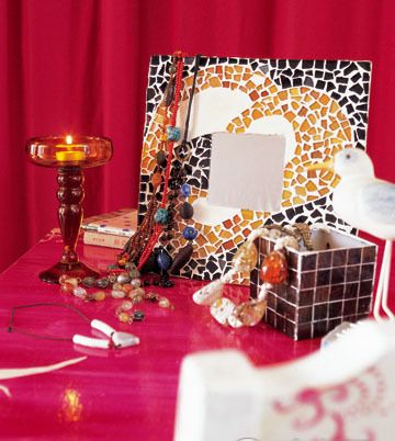 透明的馬賽克可以用來做燭臺,因為燭光能夠透過馬賽克朦朦朧朧灑出來,又不似透過普通玻璃那樣直白。還有實用的紙巾盒、花瓶都可以用馬賽克來制做,一樣的餐桌不一樣的風(fēng)情。