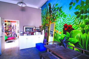 王瑩瑩的家仿佛是個花園,吊蘭從二層垂落到一層。主人沒有刻意裝飾,只是將自己喜歡的東西擺在家里。墻壁上巨大的涂鴉作品成為室內(nèi)的一大亮點。