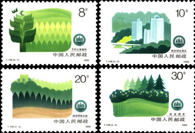 1980年3月12日,即我國第一個植樹節(jié),原郵電部發(fā)行《植樹造林,綠化祖國》特種郵票,全套4枚,第一枚“經(jīng)濟(jì)林”,面值4分;第二枚“四旁綠化”,面值8分;第三枚“飛播造林”,面值10分;第四枚“廠礦綠化”面值20分;1990年3月12日,即我國第十一個植樹節(jié),原郵電部發(fā)行《綠化祖國》特種郵票,全套4枚,第一枚“全民義務(wù)植樹”,面值8分;第二枚“城市綠化美化”,面值10分;第三枚“建設(shè)綠色長城”,面值20分;第四枚“林茂糧豐”,面值30分。兩套植樹造林郵票,圖案都以不同層次的綠色為基調(diào),清新淡雅的畫面,將人們從喧囂的世界中帶入了一個綠色、靜謐的世界,令人賞心悅目,心曠神怡。
