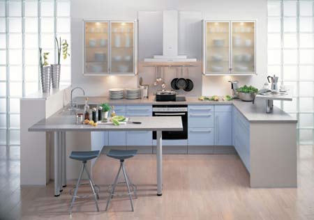 在做櫥柜時,留出一個簡單空位放置一個帶滑輪的不銹鋼架。上面可以擺放一些常用物品,用完后推回原位,這樣節(jié)省空間。如果沒有地方料理,還可以將砧板擺在最上層,做個臨時的操作臺。另外,廚房中總有些小角落,折疊或長度可調節(jié)的連柜餐桌可以充分利用這些小角落,而且上面做餐臺,下面還可以做推拉式高柜,這種儲藏能力很強的柜體大大減少了對空間的需求。如果是開放式廚房,將料理臺延伸出來做成小酒吧也是不錯的構思。
