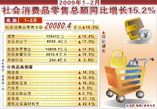 圖表:2009年1-2月社會(huì)消費(fèi)品零售總額同比增長15.2% 新華社發(fā)