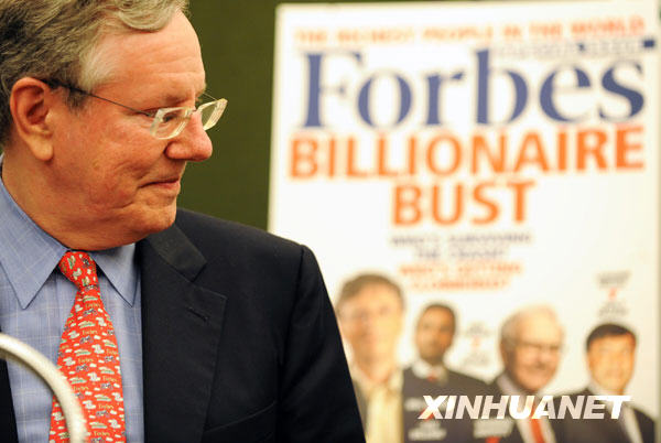 3月11日,《福布斯》雜志總編輯史蒂夫·福布斯在美國紐約出席新聞發(fā)布會(huì)。當(dāng)天,《福布斯》雜志在紐約總部舉行新聞發(fā)布會(huì),公布2009年度全球富豪榜。受金融危機(jī)的影響,2009年度上榜的億萬富豪人數(shù)從上年的1125名下降至793名,這是自2003年以來上榜富豪人數(shù)首次出現(xiàn)下降。上榜億萬富豪們的財(cái)富總額也出現(xiàn)大幅縮水,比爾·蓋茨因?yàn)樨?cái)富縮水較少,以400億美元身價(jià)重登全球富豪榜榜首。新華社記者 申宏攝