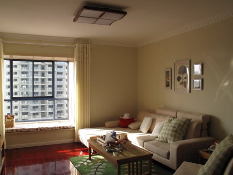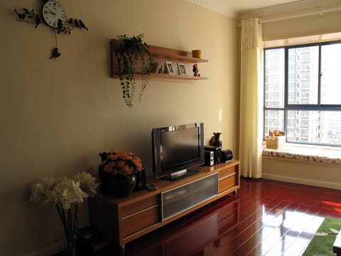 不喜歡電視背景墻就沒(méi)做 墻面是多樂(lè)士的雪中百合,網(wǎng)購(gòu)電視柜是紅蘋果,喜歡墻上的隔板。沙發(fā)是掌上明珠,看著厚實(shí),其實(shí)蠻輕飄。地板安信的鐵蘇木,打折時(shí)買的,顏色真是紅彤彤。茶幾和電話幾是迪諾雅的,家具差不多買齊了才發(fā)現(xiàn)這個(gè)牌子,實(shí)木的很簡(jiǎn)潔。
