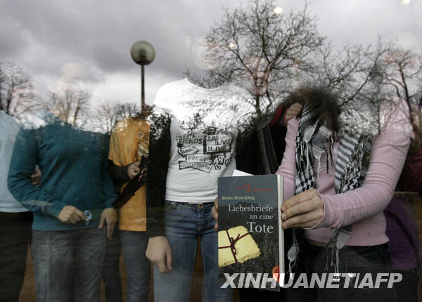 3月11日,在發(fā)生校園槍擊案的德國(guó)斯圖加特市附近小鎮(zhèn)溫嫩登一所名為艾伯特維爾的中學(xué),一名站在玻璃后的學(xué)生手中拿著一本名為《給一名亡者的情書(shū)》的書(shū)。新華社/法新