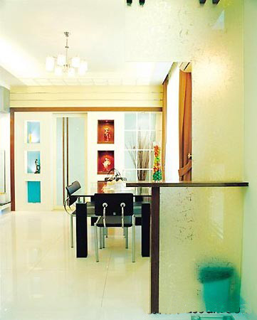 進(jìn)入門戶,就是一個(gè)吧臺(tái)形的玻璃屏風(fēng),它向上和天花板相連在一起,而在玻璃屏風(fēng)上則放了一個(gè)造型簡(jiǎn)潔的玻璃瓶,瓶?jī)?nèi)放入一些艷麗色物,起到畫龍點(diǎn)睛之筆。