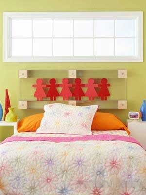 這估計(jì)是最有創(chuàng)意最簡(jiǎn)單的床頭設(shè)計(jì)了。用一種歡快的字體在床頭的位置題寫一句孩子最喜歡的箴言。