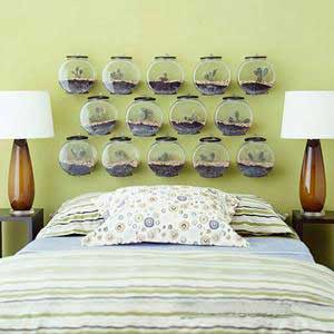 用塑料小魚缸組合成的超創(chuàng)意床頭。這無疑是喜愛戶外嬉戲的孩子們的最愛。魚缸里可以擺放喜愛的水藻或植物,擺放出各種造型。