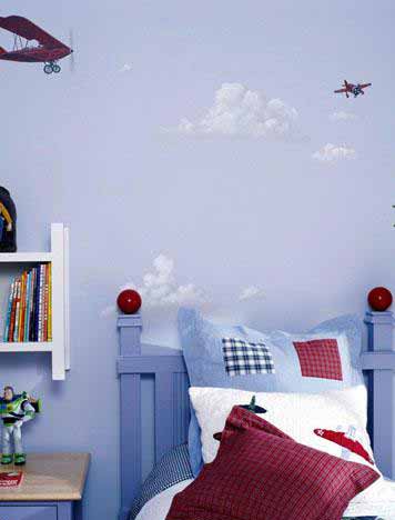 天藍(lán)色的背景,生動(dòng)的傳達(dá)了一個(gè)小男孩想插上夢(mèng)想的翅膀。墻壁上栩栩如生的畫著天空的云彩和飛機(jī),每朵云和每架飛機(jī)都是形態(tài)各異的。藍(lán)色的家具融入在藍(lán)色的背景里。床邊的白色架子是收藏故事書(shū)絕佳的地方。