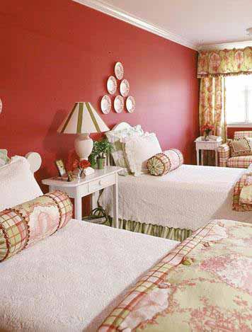 羽絨被和枕頭和諧的格調(diào)襯托出深色的墻壁,幾種色彩元素和面料元素在這間房間里被反復(fù)的體現(xiàn),營(yíng)造了一個(gè)相對(duì)統(tǒng)一的格調(diào),個(gè)性化的花條紋燈罩與柔軟的床相映成趣。這里的一切看上去都是那么的溫暖貼心。
