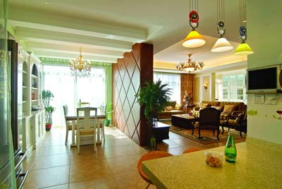 客廳的主題墻為真皮飾面,真皮飾面的沉實(shí)色調(diào),透過客廳、餐廳的兩盞水晶吊燈變得柔和瑰麗,呈現(xiàn)出莊嚴(yán)的大宅風(fēng)貌;淺色的仿古磚地面,再配襯以精心挑選的布藝家私,頓時(shí)讓略顯古板的空間平添生機(jī);客廳、餐廳的隔而不斷,相互呼應(yīng),營造出交錯(cuò)變化的空間感。同時(shí)大氣的棕黃色與明快的亮白色形成鮮亮的對(duì)比,使業(yè)主能瞬間體會(huì)移步換景的感覺。