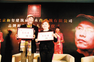 影視明星劉佩琦的首個(gè)代言品牌選中和璽木門,意味著木門行業(yè)的品牌競爭將加劇。圖為劉佩琦與和璽公司董事長安鐘巖(右)向媒體展示雙方的簽約書。