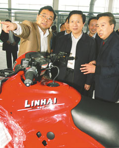 昨天(19日),在林海動力機械集團,江蘇省委書記梁保華饒有興致地參觀了該公司開發(fā)的摩托車、割草機、發(fā)電機等各式新產(chǎn)品。記者 于先云攝