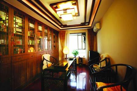 床前漆面斑駁的木箱雖略顯滄桑,卻使文雅意境愈加沉穩(wěn);牽動細(xì)膩心思的胭脂粉簾,仿古而不泥古;臥榻兩側(cè)的地?zé)?,雕飾玲瓏有致;架子床溫情浪漫,伴著主人每晚安枕熟睡。字畫、玉石、鼓凳等的點(diǎn)綴,更一堂雅氣。