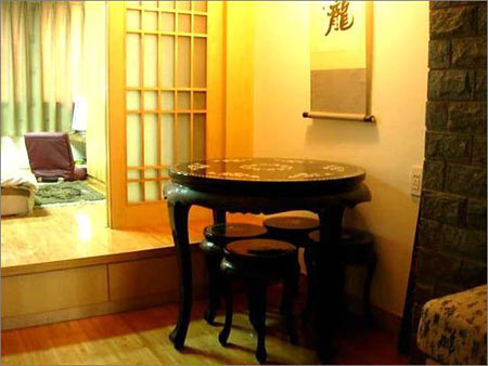 青磚處原本是客臥的間隔墻。敲掉后將臥室向里移了1米多,抬高做了地臺。梁不能敲,干脆帖上青磚,算客廳和餐廳的隔籪斷。