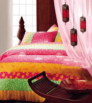 1.這款香艷的床品集合了春夏的多種色彩,具有東南亞民族特色的圖案為居室增加了幾分妖嬈的魅惑力。