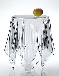 硬質(zhì)腈綸材質(zhì),手工打造,顛覆人們對(duì)桌子和桌布的慣常理解。我們見慣了四條腿的桌子和桌子上垂下的柔軟的桌布,這次看起來(lái)貌似柔軟的透明桌布居然四只腳立在地上,是不是很新奇呢?