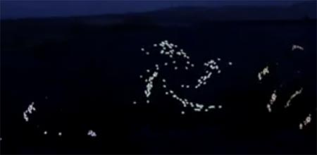 畫面上,一只牧羊犬身披發(fā)光二極管“外套”,奔上山坡,像一團焰火躥上漆黑的夜空。突然,預(yù)先“埋伏”在山坡上的羊群四散,身上的發(fā)光二極管“外套”同時亮起,宛如煙花綻放。