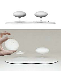 這其實(shí)是一只磁懸浮調(diào)料瓶,它的整體被設(shè)計(jì)成白色,共有三個(gè)部分:調(diào)料瓶、底座與基座。兩個(gè)橢圓形的調(diào)料瓶被安放在磁體支撐的小巧底座上,而這兩個(gè)小巧的底座通過與基座之間的磁力作用懸浮在空中從而起到對調(diào)料瓶的支撐作用。