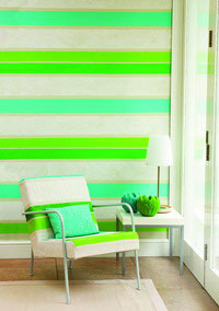 以一種由青綠色和淡黃綠色條紋組成的家居織物作為創(chuàng)意的來源,在墻上涂抹出相同的圖案,這種現(xiàn)代風(fēng)格的嘗試,像是一匹放大的椅子包面,產(chǎn)生出奇妙的視覺幻象,適用于裝飾起居室,同時也適用于臥室。