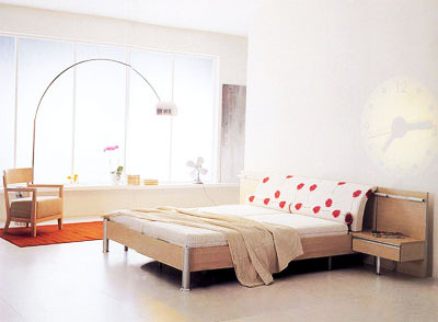 利落的線條充滿整個房間,原木色的寬邊床可移動的小幾設計周到,背景墻上錯落安置的CD架,利用材料的多元變化和幾何造型的有機融入,讓視覺呈現(xiàn)出舒緩的起伏,金屬衣架豎立要床旁,既實用又強調了空間的設計感。