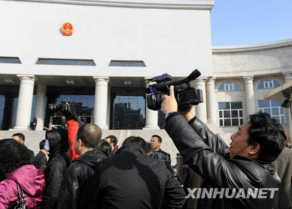 3月24日,一名電視記者在哈爾濱市中級人民法院門前拍攝。當(dāng)日,哈爾濱“10·11”案在哈爾濱市中級人民法院公開審理。新華社記者 李勇攝