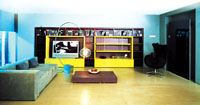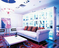 將燈光與周邊環(huán)境和諧搭配是配飾設(shè)計(jì)師要考慮的重點(diǎn)問(wèn)題。在這個(gè)有著60年代新懷舊風(fēng)格的書房中,高挑的落地書柜,仿佛一堵透明的墻,將水晶吊燈投注的光束折射過(guò)來(lái),整個(gè)書房被映照的格外明亮。隱匿于書柜中的低能燈泡散發(fā)出柔和的光輝,使書房顯得更加舒適與溫馨。當(dāng)臥室一角的光線透過(guò)書柜傾瀉進(jìn)來(lái),書房的一切都隨之通透起來(lái)。奢華的水晶燈在玻璃書柜的映襯下光芒四溢。