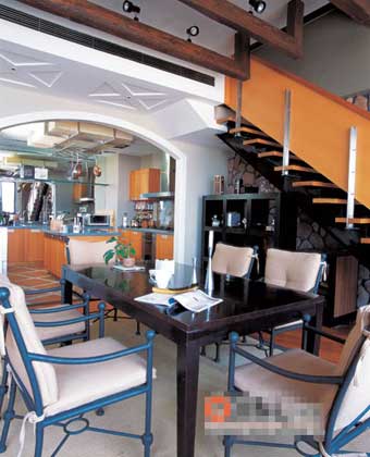 開放式廚房隱藏在餐廳的身后,若只是坐在客廳休息,很難看到鍋碗瓢盆這些可愛的廚房元素。